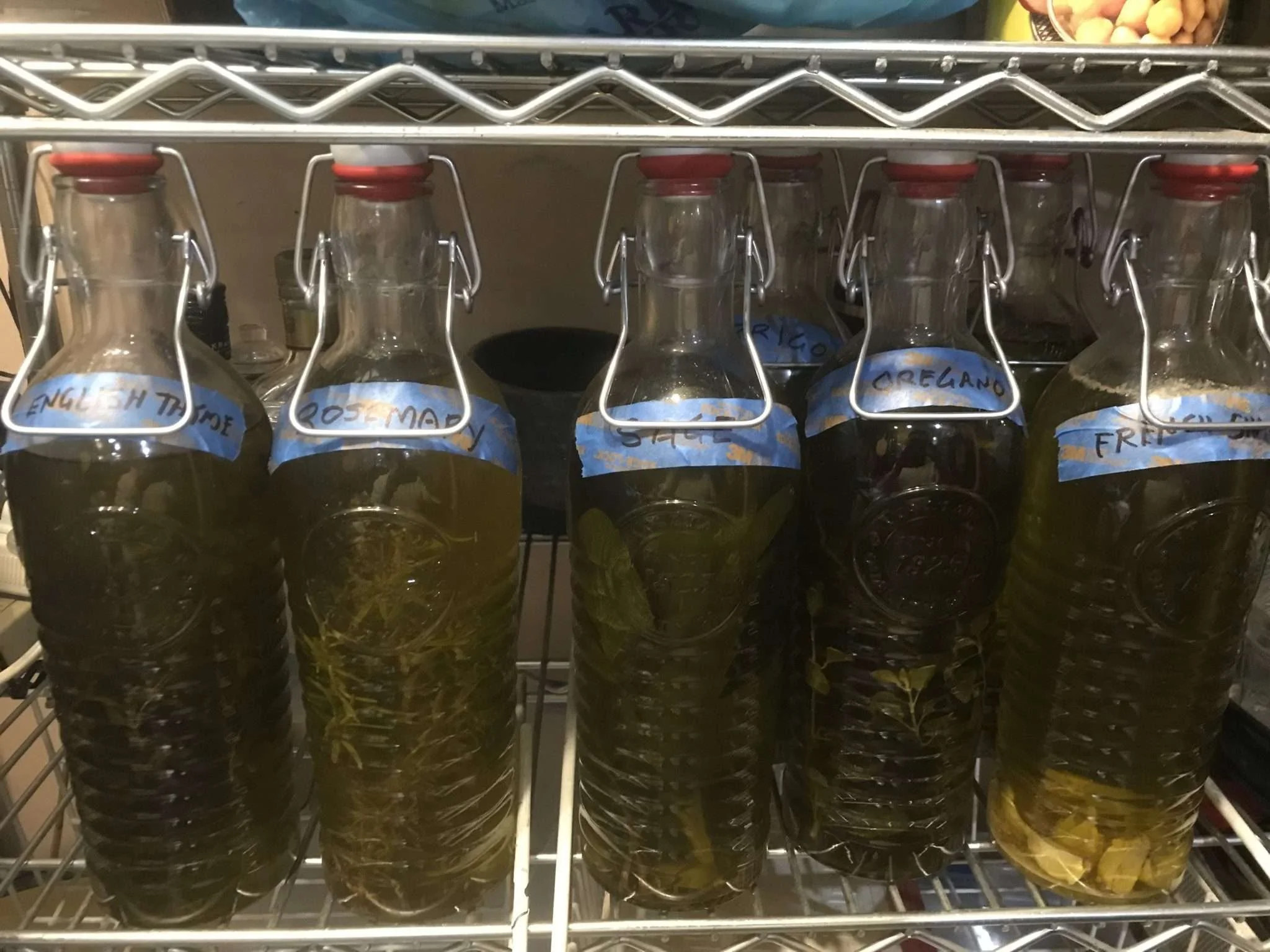 This year an herb garden was added to the "rooms" that were already installed. It was a compromise between Jim and I. The property and gardens are divided between ornamental for me, and pracical/productive or food for him. Actually it created practical and productive results for me as well. It resulted in adding a "bloom" of flavor for the kitchen as well as the garden. Not only did it add to the plentifullness of Jim's garden, but it inspired new activity in the kitchen. It's amazing how significant the change was to have fresh herbs just outside the door that could be grabbed in a moment. Recipes that would have been put on hold to try later, when I could get the herbs, were executed immediately. I keep a pair of scissors in the utensil jar to grab as inspiration required.Not only did the new section of the garden add immediate satisaction and impulse, but it's providing a continual burst of flavor in foods this winter. Jim bought bottles and plain virgin olive oil to infuse with the taste of our summer garden. I can now chum and tantalize diners as I saute and cook with these potent oils all winter. English Thyme, Rosemary, Sage, Oregano, French Shallot, Tarragon, Garlic, or any combination, are all just a reach away in the winter kitchen. All inspired by flavored oils that I used to buy at a high price point with less potency.These, plus the bay leaf wreath that Jim bought me for Christmas, are wonderful gifts from nature, the garden, and a little effort in the spring. I dont think that I could do without them now that I have them. It only takes a few weeks of waiting, some occassional shaking, and a little imagination. The joy of strolling through the garden, tasting the herbs, and talking about the possibilities of them was an additional treat. Several types of mints were available. Watching visiting children chose thier favorite herbs to bruise and infuse their water or ice teas, was a treat in itself to the adults watching them interact with the garden. My inner child was enthused with them. If your considering adding herbs to your garden, I highly recommend it.