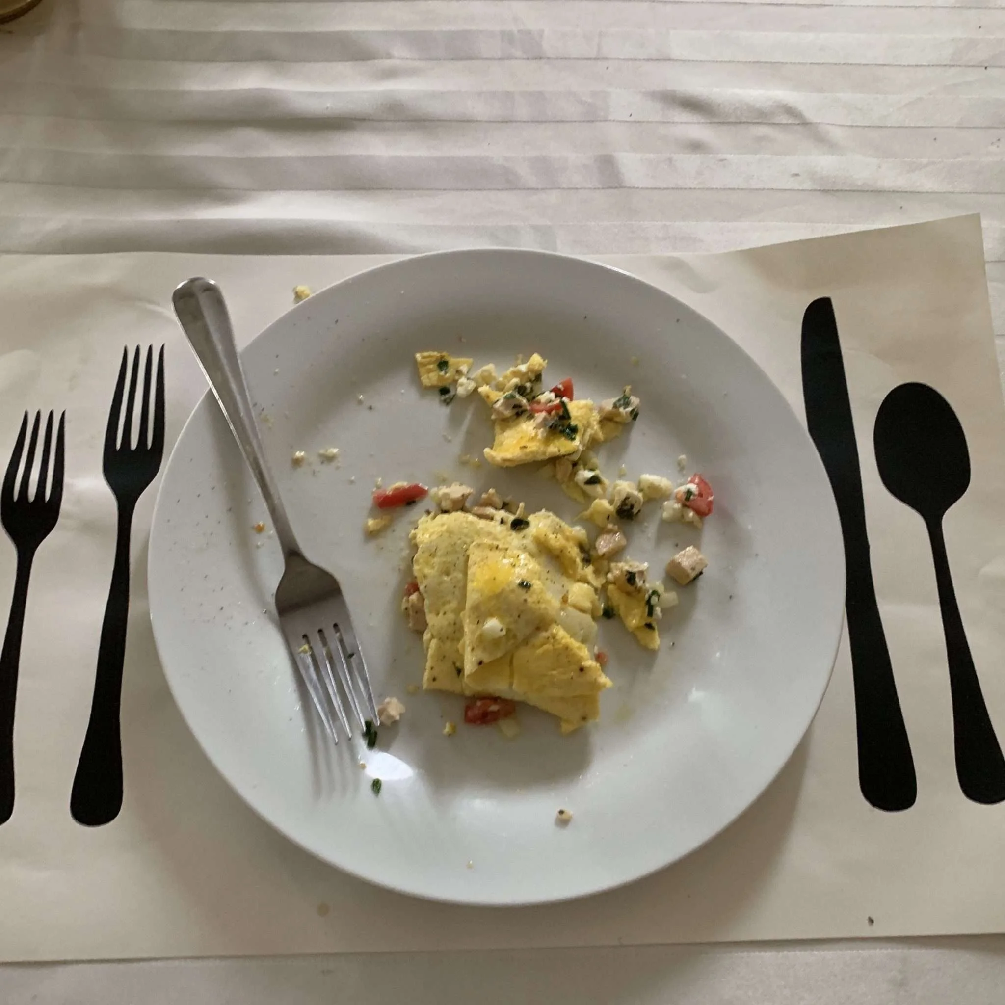 whip eggs in a bowl. Add milk whip until frothy.Chop all ingredients and have them ready.With medium heat, Add butter to a cast iron pan. Melt butter.Pour in eggs. Let them cook for a moment. Turn pan to distribute eggs evenly.Add ingredients to the egg base. Let the cheese melt.Fold eggs over. Let rest for a moment. Serve with rye toast and butter.Serves 2[media-credit id=3 align="alignnone" width="300"]