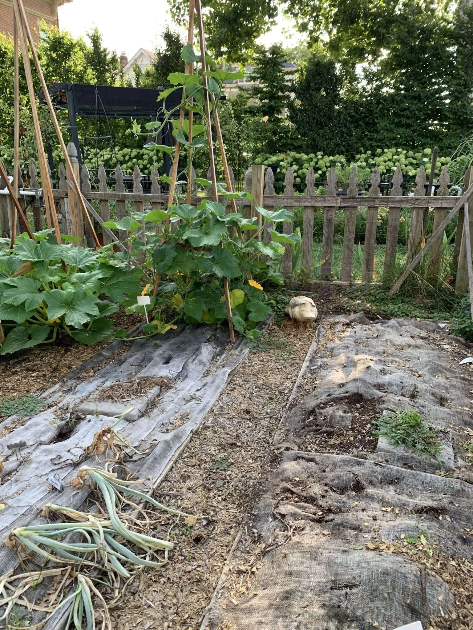 The most astounding victory of this burlap mulch for me has been the near complete termination of poke and belladonna in my garden. In 2018 I had a poke, belladonna, and cherry tomato catastrophe. Nothing grew. I could NOT keep up with the weeds. I felt like such a failure. I have had 3 (Three) poke plants so far in this garden. One beneath the burlap and two that grew along the edge. Belladonna is still an issue along the perimeter but has yet to grow where there is burlap.The next horizon to explore is how to keep the fence line around the garden poke, belladonna, rye and crab grass, and rabbit and groundhog free. The plants love to grow in the welded wire fencing that is behind the picket fence. The wire keeps chicks, rabbits and groundhogs our really well, but is a liability with the weeds. This is where focus will lay next. If you have any solutions, hit me up!