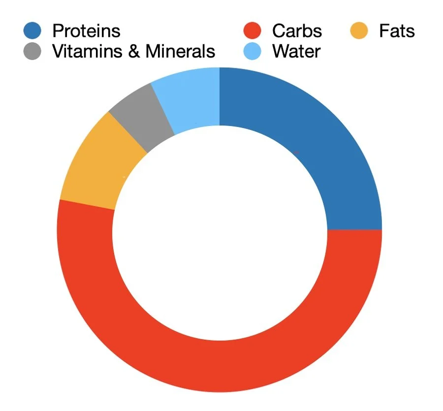 This is generally not how humans think of food (see MyPlate above) and it can get complicated fast, but it doesn’t have to if you are using simple and fresh ingredients. Ingredients that animals consume every day, namely insects, weeds and grasses. We just need to balance out the proteins and the carbs a bit. The Lipids and minerals sort themselves out. The same is true with the water amounts.