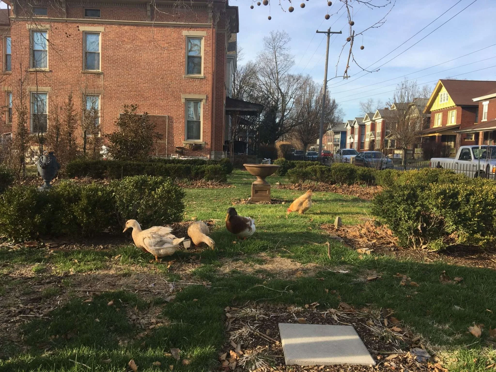 April is here. The grubs and pests are waking up, but the plants aren’t yet sending up their tender shoots. It’s the perfect time to let the ducks and chickens forage.Both species of birds are the perfect gardeners friend if used correctly. It’s about balance. Ducks will eat anything with tender shoots. Chickens will turn any garden into a barren wasteland. The art of incorporating livestock into an urban garden is understanding their natures and knowing when their nature will be useful or destructive.The formal gardens need their soil turned. Everything needs a little bit of loving early on. Later in April I will plant a “chicken garden” that the little dinosaurs can obliterate to their hearts content. But today, they are welcome soil turners. Just like nature intended.
