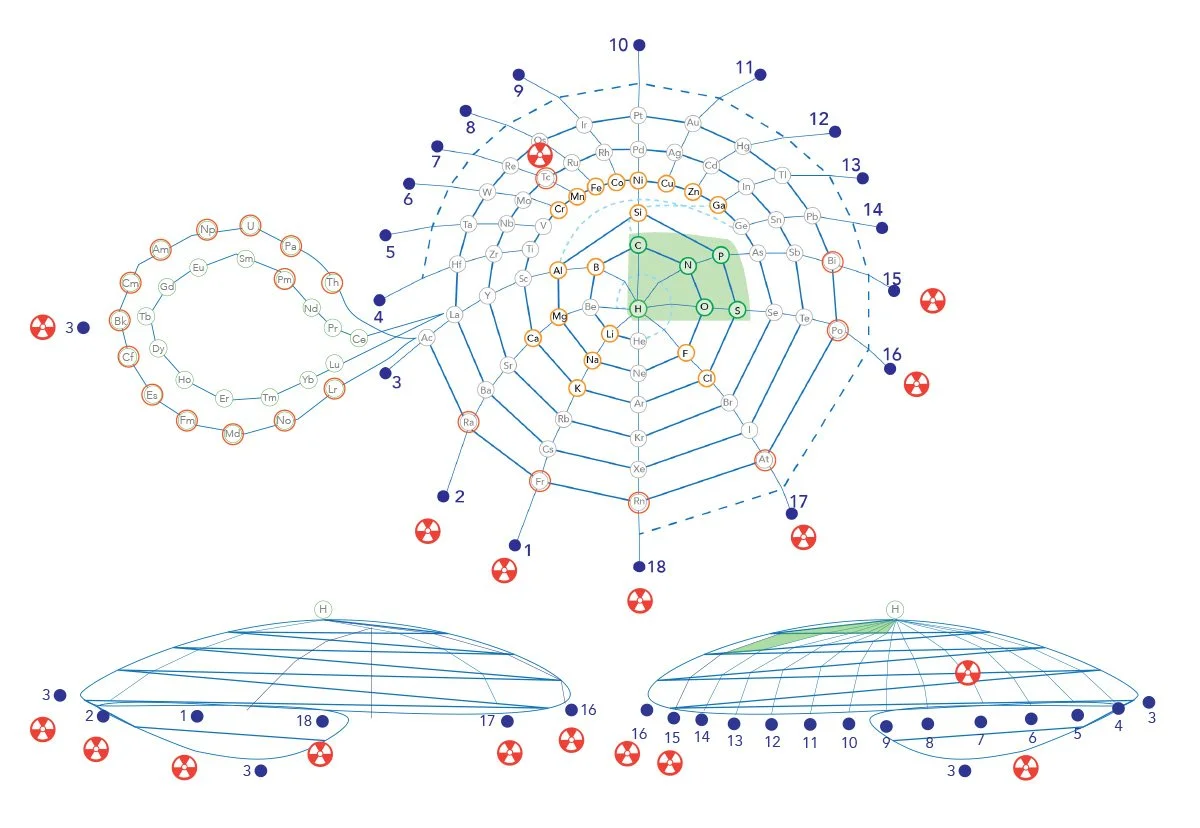 Plan and elevation views of the Periodic Table as a web of life. Note the radioactive edge, the flip under of period 3 and the location of the green zone.
