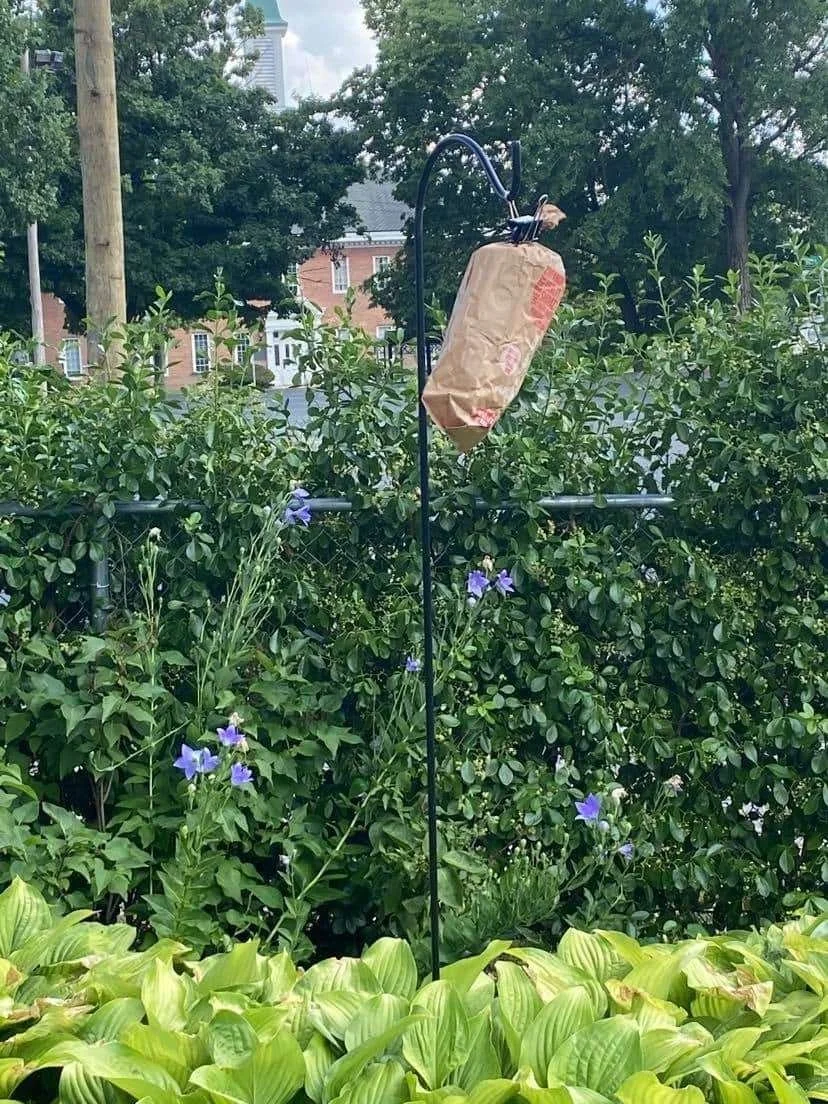 We have been searching for the best way to deal with the wasps without introducing chemicals into the ecosystems. What we came upon was recreating a wasps nest close to the pond. Rick placed a paper bag out by the pond. I’m pretty sure it’s just a Wendy’s take away bag her found out in the alley.