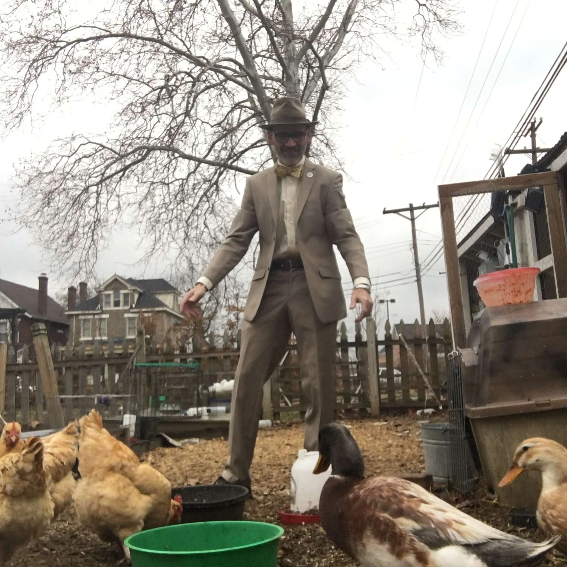 I like to imagine I am shooting an editorial for GQ Magazine. In this photo Jim is wearing a $79 suit from @Amazon, a $3 dress shirt from @OhioThriftStores, $6 crew socks from @Menards, $30 shoes from @DSW, a $70 bow tie from @Macy’s and a $70 @CountryGentleman trilby fedora. Don’t skimp on the hat or the bow tie; even the chickens will judge you for that.